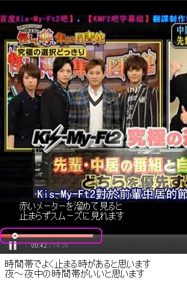 ブログ内を検索出来るところでキスマイって検索すると再アップしたのがあるよ                                                                             56.comだから多少動画が映るまで1分くらいかかるかも!動画が見れてもとまる場合は画像のように赤いメータを貯めて見るとスムーズに見れます                                                                                                                     123